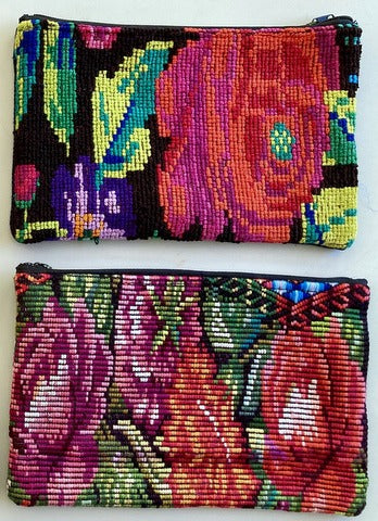 There is full huipil cloth on BOTH sides of this case! These are a needlepoint look with beautiful tropical flowers.